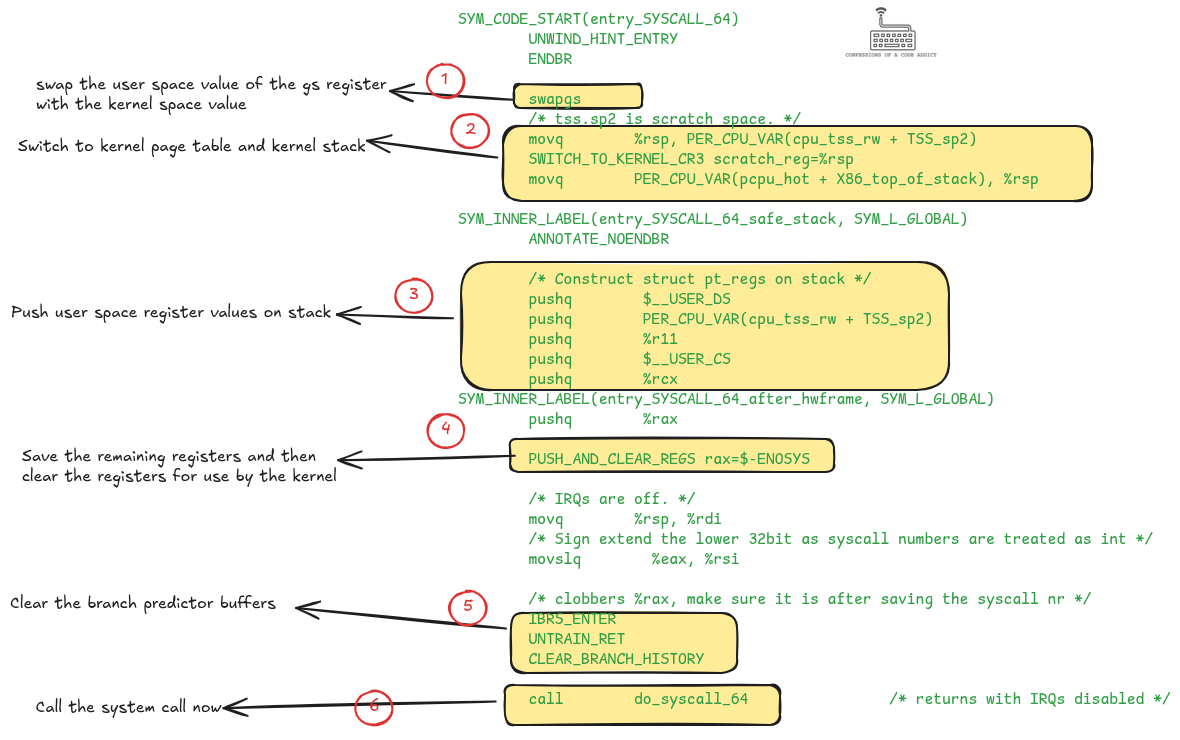 Now that we have this high-level overview, let’s look inside the Linux kernel’s syscall handler to understand each step in more detail.