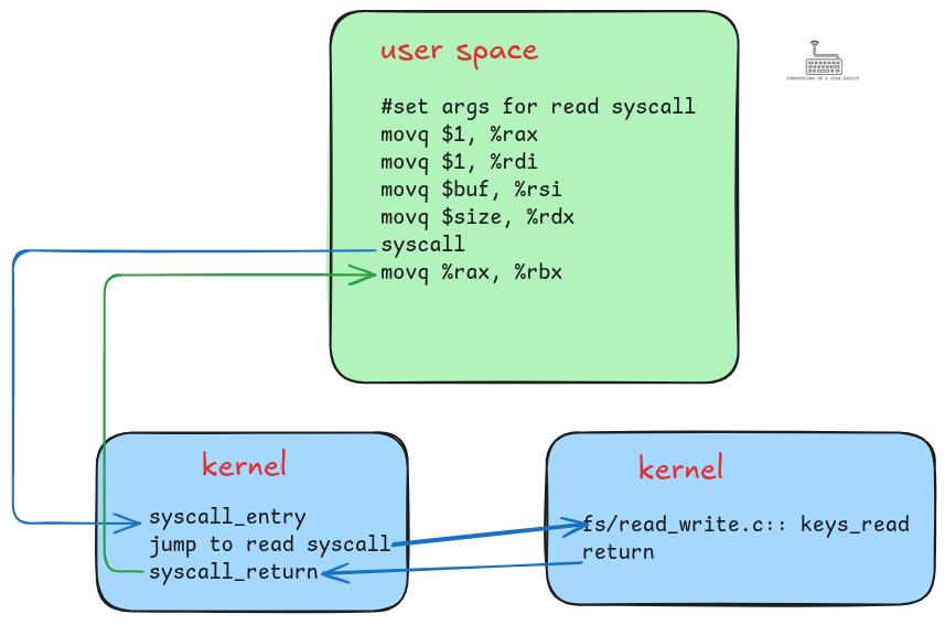 ), and then returns control back to user space.In the figure: