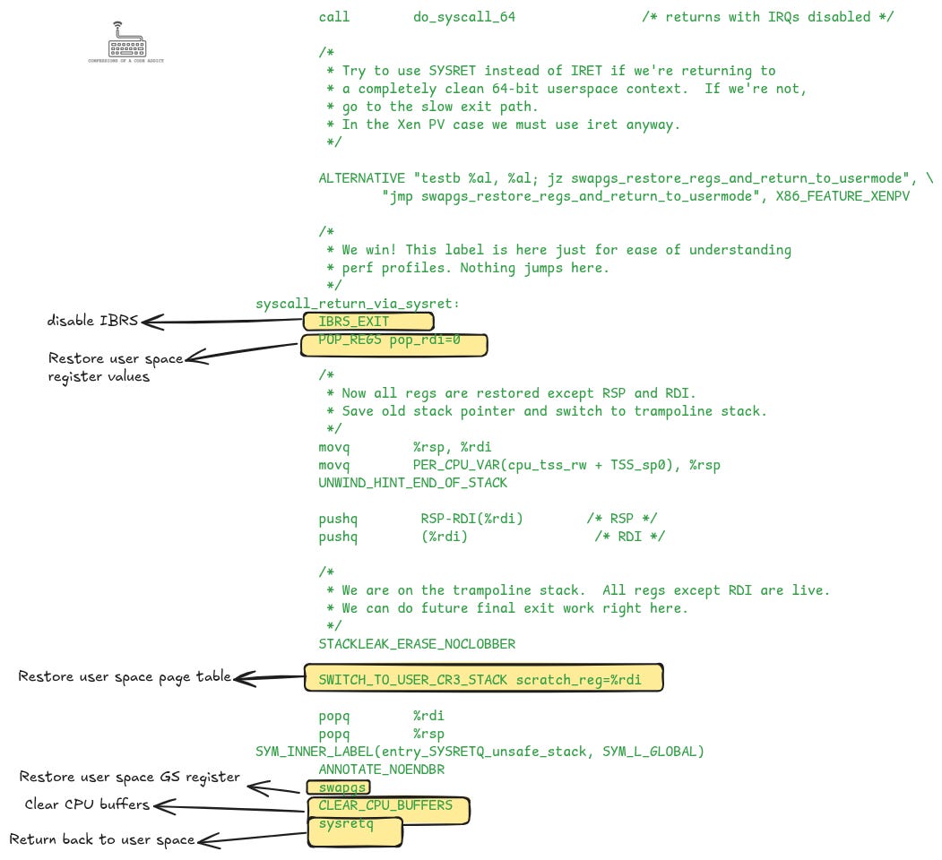 ), showing how the kernel restores user registers, page tables, and state before returning control to user space.Now that we have seen all the code the kernel executes to enter and exit a system call, we are ready to discuss the overheads introduced. There are two categories: